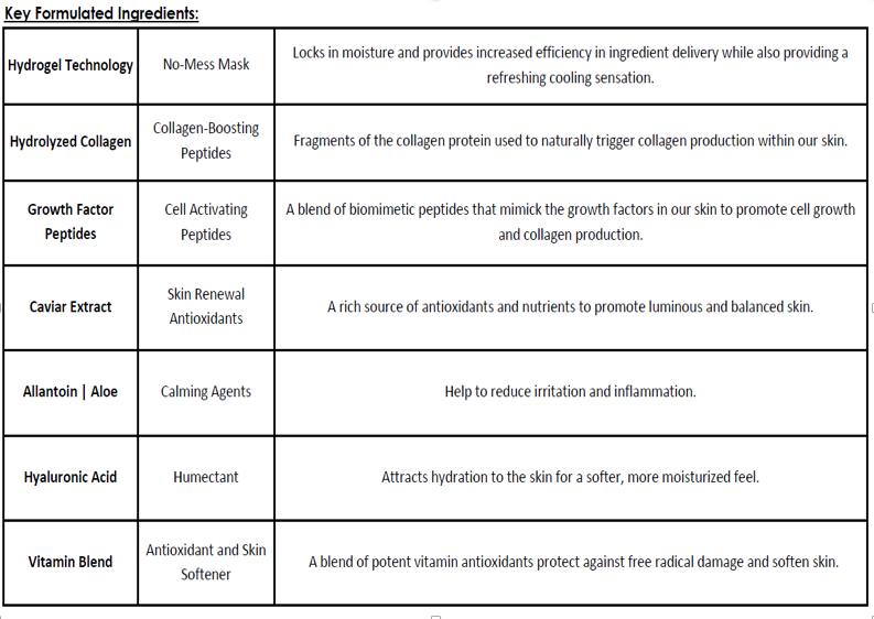 Ez a hidrogél a szemkörnyék fiatalításához olyan kulcsfontosságú peptidekkel van ellátva, amelyek növelik a természetes kollagén termelést és hidratáló összetevőket is tartalmaz, amelyek redukálják a ráncokat és DNS szinten hatnak. Emellett világosító komponenseket is tartalmaz, amelyek eltávolítják a szem alatti kék karikákat és kivilágosítják magát a szemkörnyéket. Segítenek növelni a bőr kollagén tartalmát, ezáltal az teltebb és feszesebb lesz. Minimalizálja a duzzadásokat. Azonnal és tartósan hidratál. Minden bőrtípusra megfelelő.