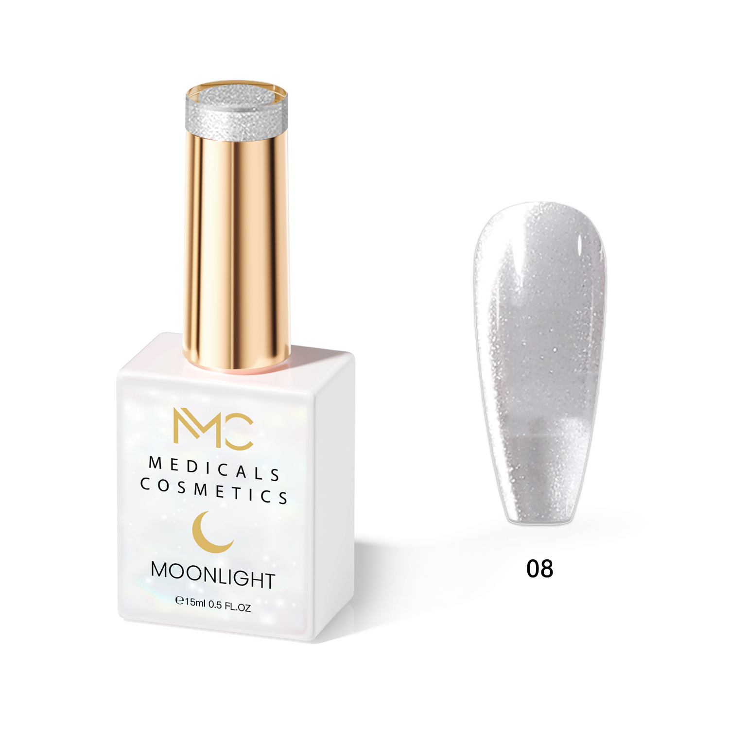MOONLIGHT GEL POLISH HEMA FREE NAILS COLOR GEL PROFESSIONAL MC MEDICALS COSMETICS MC MOONLIGHT 08 Átlátszó, gyöngyházfényű ezüst körömzselé csillogó hatással és 3D effektussal UV lámpa alatt. HEMA FREE