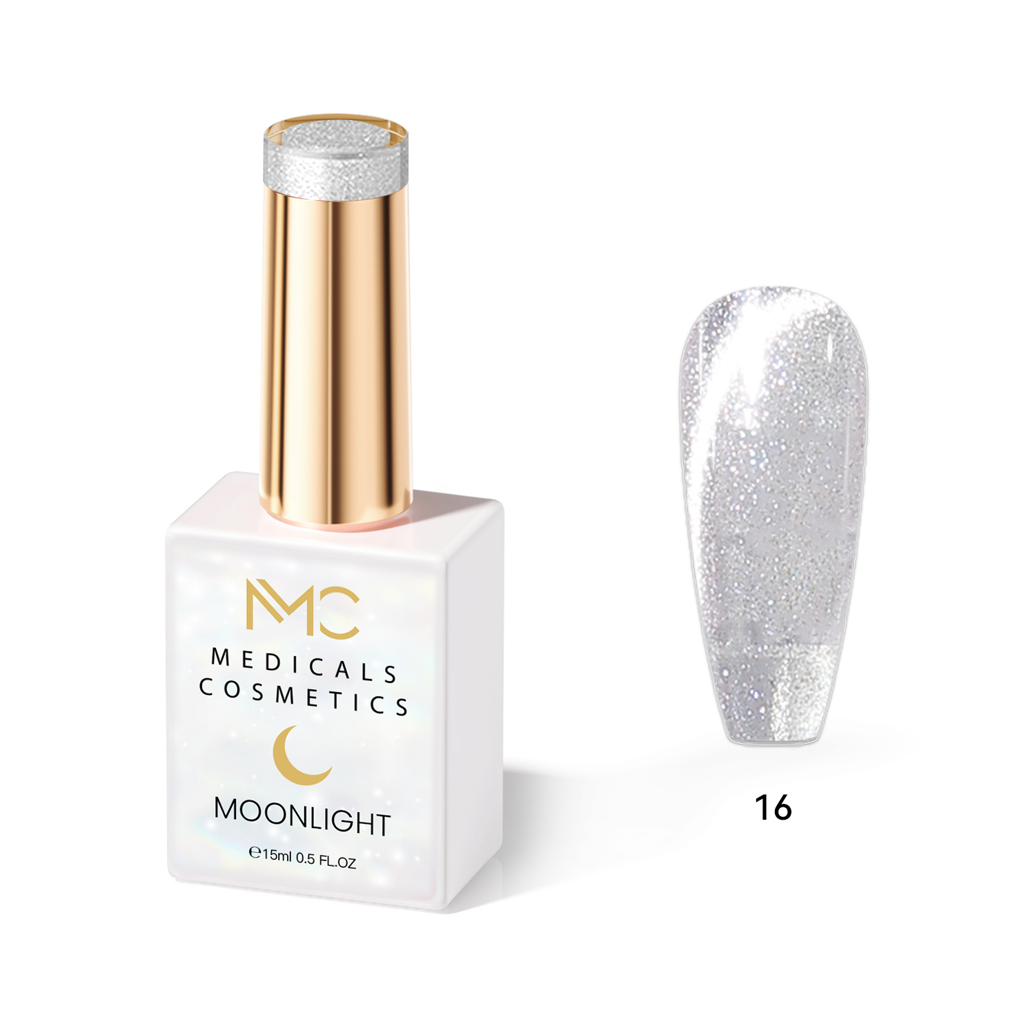 MOONLIGHT GEL POLISH HEMA FREE NAILS COLOR GEL PROFESSIONAL MC MEDICALS COSMETICS MC MOONLIGHT 16 Átlátszó, gyöngyházfényű ezüst körömzselé csillogó hatással és 3D effektussal UV lámpa alatt. HEMA FREE