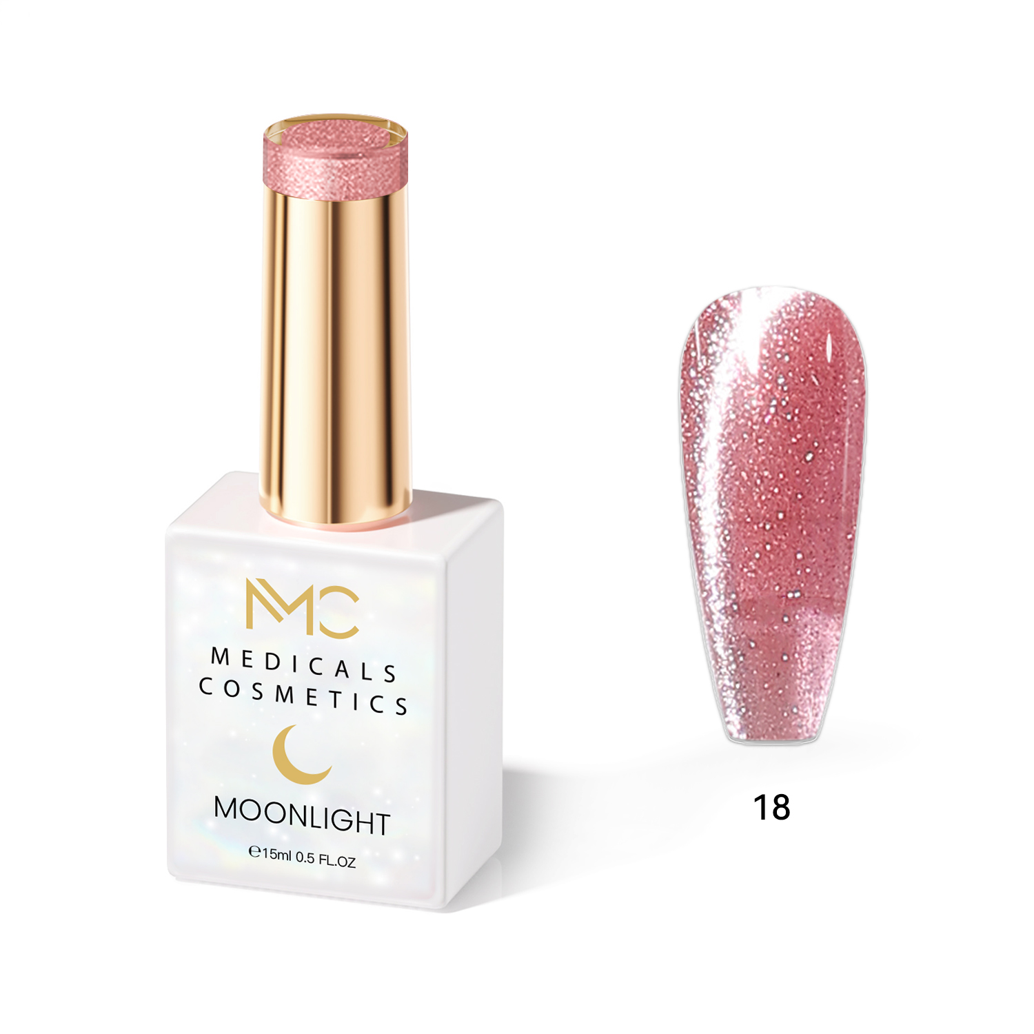 MOONLIGHT GEL POLISH HEMA FREE NAILS COLOR GEL PROFESSIONAL MC MEDICALS COSMETICS MC MOONLIGHT 18 Átlátszó, gyöngyházfényű rózsaszín körömzselé csillogó hatással és 3D effektussal UV lámpa alatt. HEMA FREE