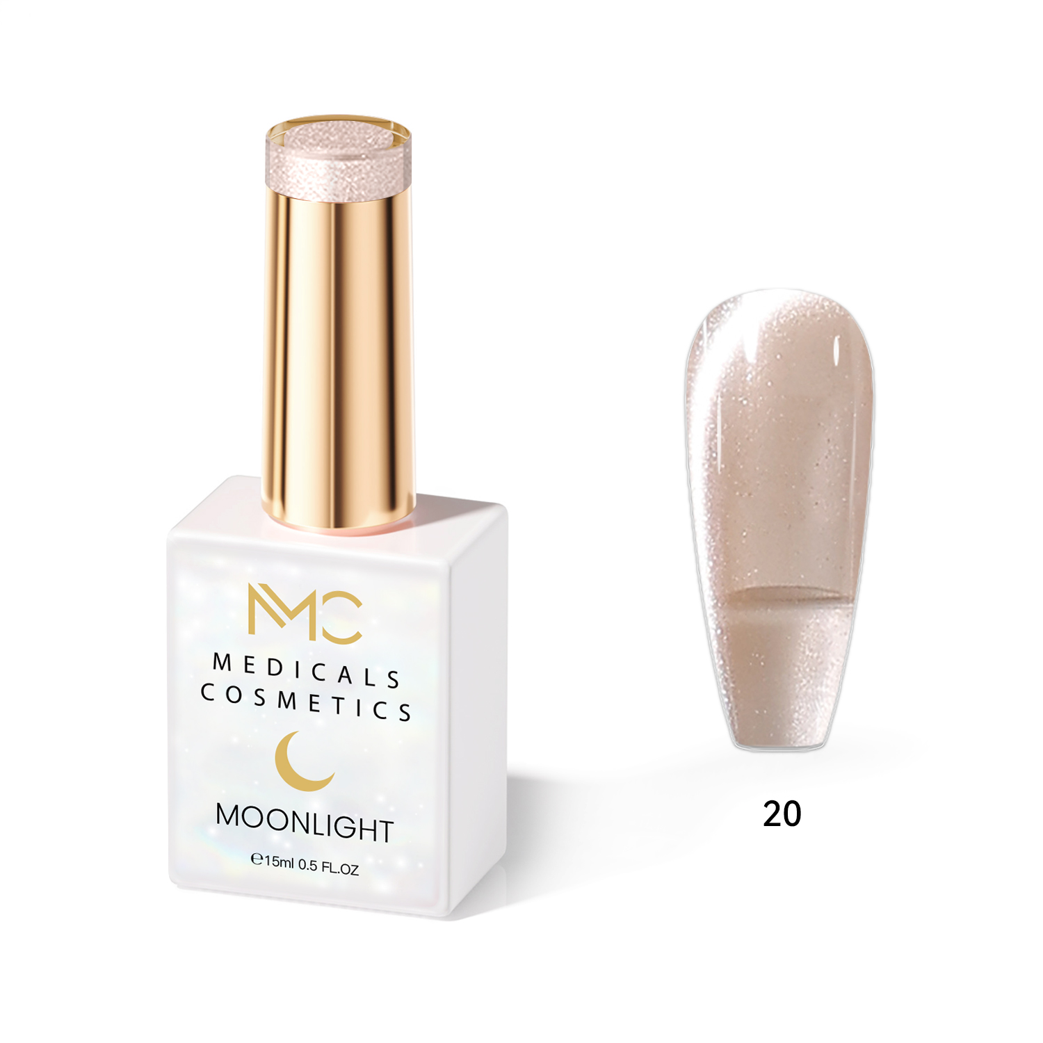 MOONLIGHT GEL POLISH HEMA FREE NAILS COLOR GEL PROFESSIONAL MC MEDICALS COSMETICS MC MOONLIGHT 20 Átlátszó, gyöngyházfényű bézs körömzselé csillogó hatással és 3D effektussal UV lámpa alatt. HEMA FREE