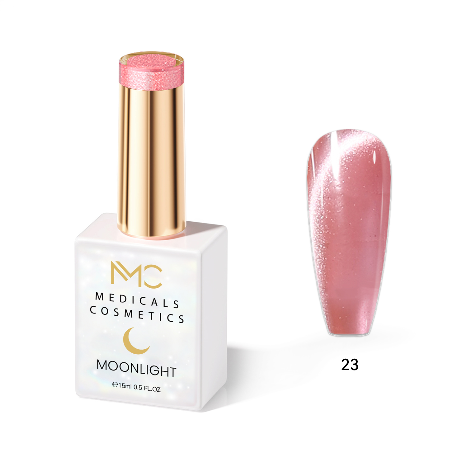 MOONLIGHT GEL POLISH HEMA FREE NAILS COLOR GEL PROFESSIONAL MC MEDICALS COSMETICS MC MOONLIGHT 23 Átlátszó, gyöngyházfényű rózsaszín körömzselé csillogó hatással és 3D effektussal UV lámpa alatt. HEMA FREE