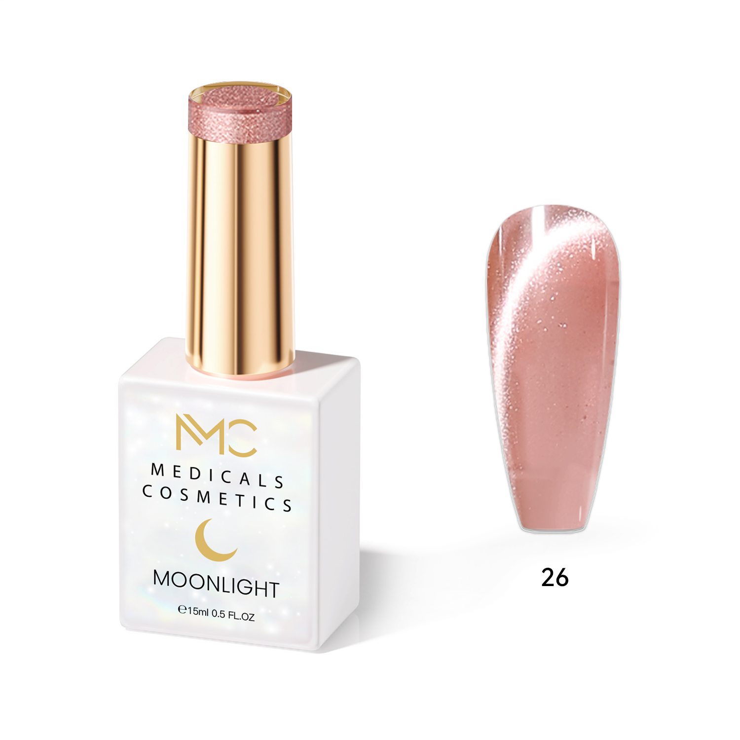 MOONLIGHT GEL POLISH HEMA FREE NAILS COLOR GEL PROFESSIONAL MC MEDICALS COSMETICS MC MOONLIGHT 26 Átlátszó, gyöngyházfényű rózsaszín körömzselé csillogó hatással és 3D effektussal UV lámpa alatt. HEMA FREE