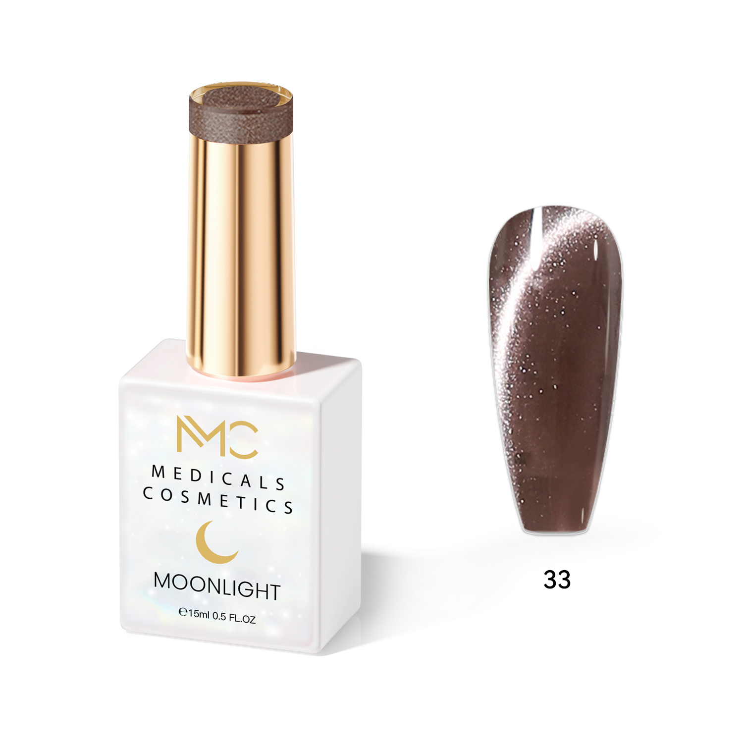MOONLIGHT GEL POLISH HEMA FREE NAILS COLOR GEL PROFESSIONAL MC MEDICALS COSMETICS MC MOONLIGHT 33 Átlátszó, gyöngyházfényű barna körömzselé csillogó hatással és 3D effektussal UV lámpa alatt. HEMA FREE